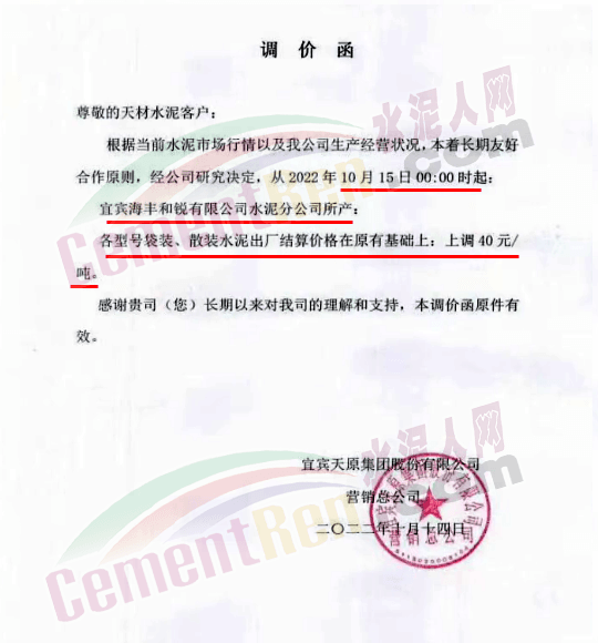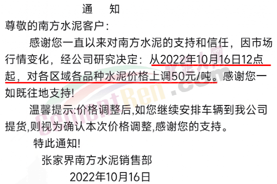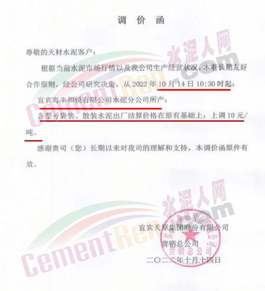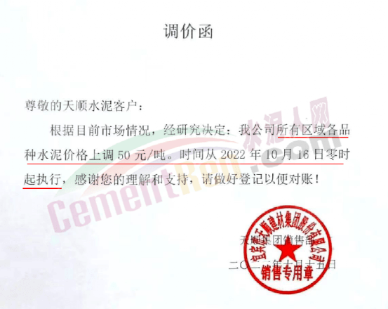 四川宜賓市天順建材集團股份有限公司通知自10月16日零時起,所有區域各品種水泥價格上調50元/噸。