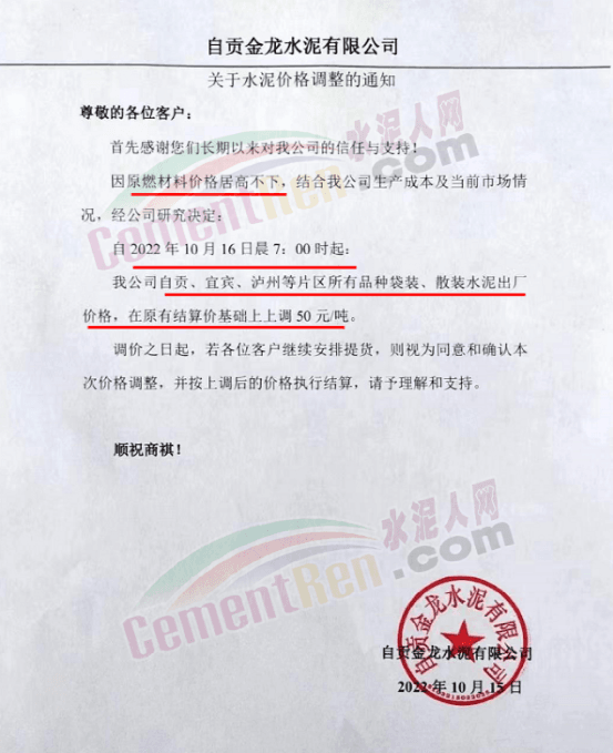 自貢金龍水泥有限公司通知因原燃材料價格居高不下,結合公司生產成本及當前市場情況,經公司研究決定10月16日上午7時起,自貢、宜賓、瀘州片區所有品種袋裝、散裝水泥出廠價上調50元/噸。