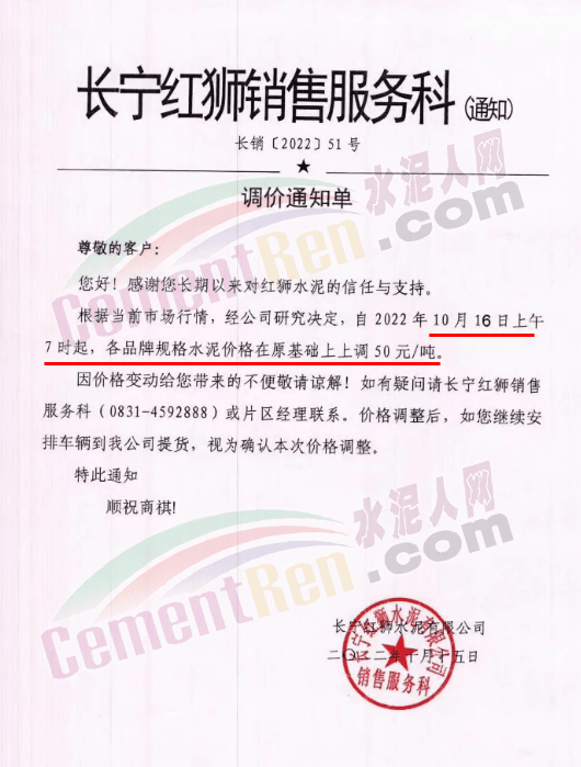 長寧紅獅銷售服務科通知,10月16日上午7時起,各品牌規格水泥價格在原基礎上上調50元/噸。