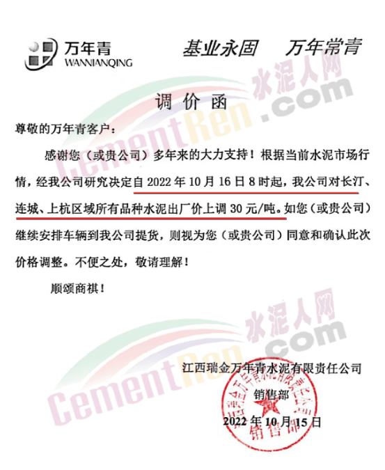 江西瑞金萬年青水泥有限責任公司通知10月16日8時起,公司對長汀、連城、上杭區域所有品種水泥出廠價上調30元/噸。