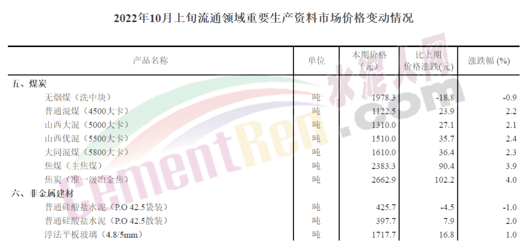 國家統計局10月14日發布的2022年10月上旬流通領域重要生產資料市場價格變動情況顯示,4500~5800大卡煤炭價格仍處于上行通道,其中5800大卡、5500大卡煤價均超過1500元/噸,而上年同期各規格煤價均在1500元/噸以下。