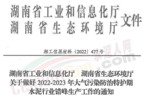 湖南省發布《關于做好2022-2023年大氣污染防治特護期水泥行業錯峰生產工作的通知》要求 2022-2023年大氣污染防治特護期間,長株潭及傳輸通道城市(岳陽市、常德市、益陽市)水泥熟料生產線錯峰生產天數基數為80天,其他市州為75天,其中2022年第四季度(10月16日-12月31日)錯峰生產時間不少于30天。