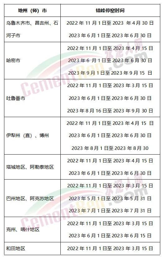 新疆維吾爾自治區發《關于下達2022至2023年水泥錯峰生產計劃的通知》稱,為持續做好新疆水泥常態化錯峰生產工作,在充分調研全疆各地采暖期長短、空氣質量情況、各水泥企業對錯峰生產時間的意見建議及下一年度水泥市場需求情況的基礎上,特制定2022至2023年水泥錯峰生產計劃。