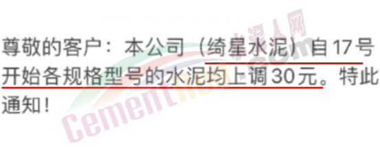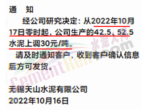 水泥人網通訊員消息,長三角蘇錫常區域多家企業通知上調水泥價格30元/噸。區域內主要品牌企業無錫天山水泥、綺星水泥通知,自17日起上調30元/噸。