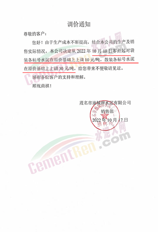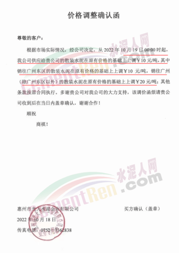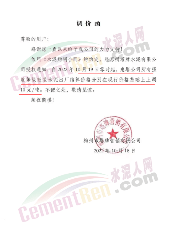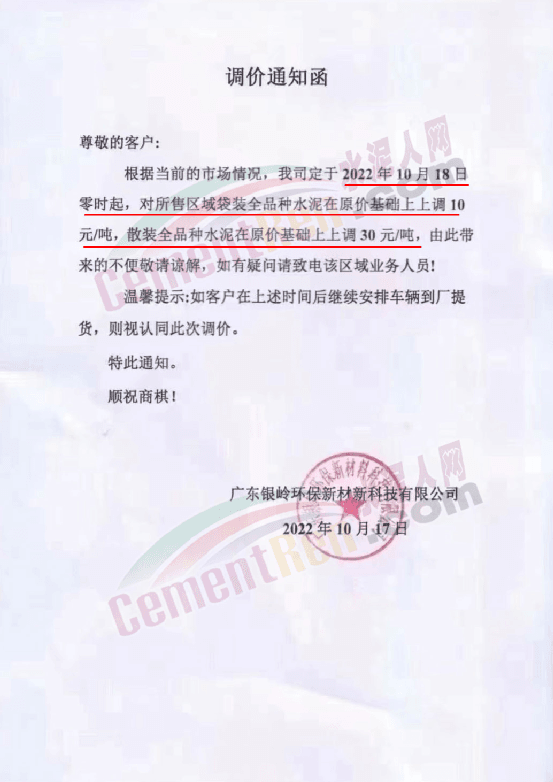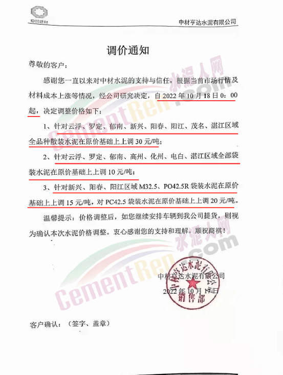 與此同時,珠三角區域中材天山、中材亨達、華潤水泥、臺泥水泥、塔 牌水泥、光大水泥、青洲水泥等水泥企業通知上調水泥價格10-30元/噸,下游商混企業紛紛跟進。