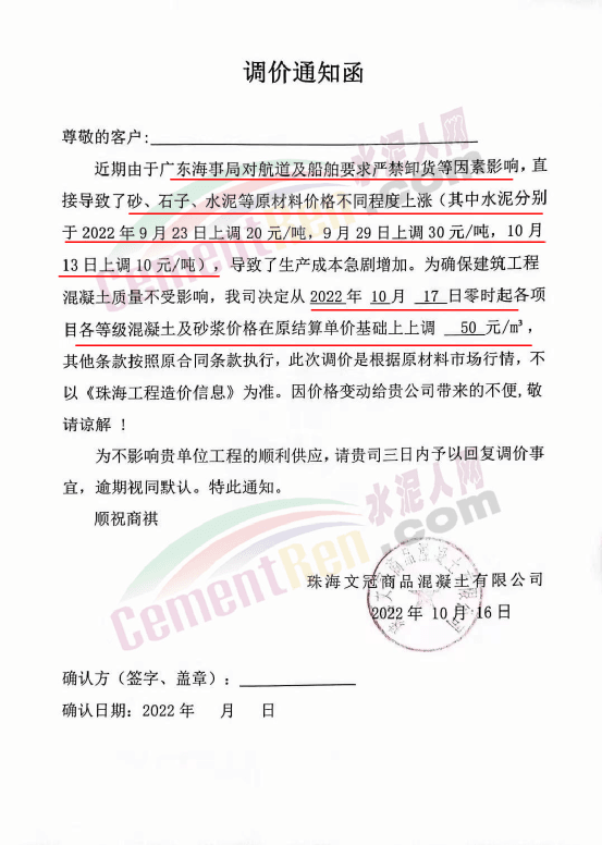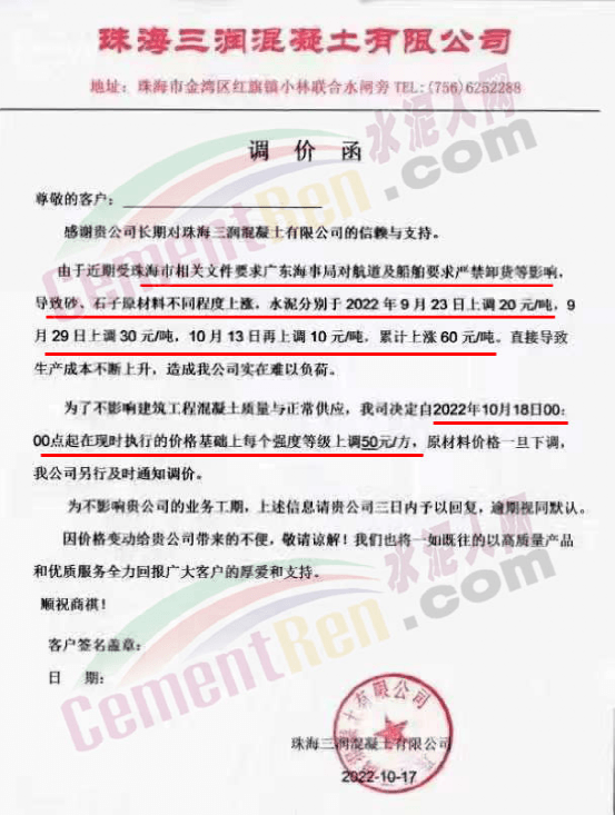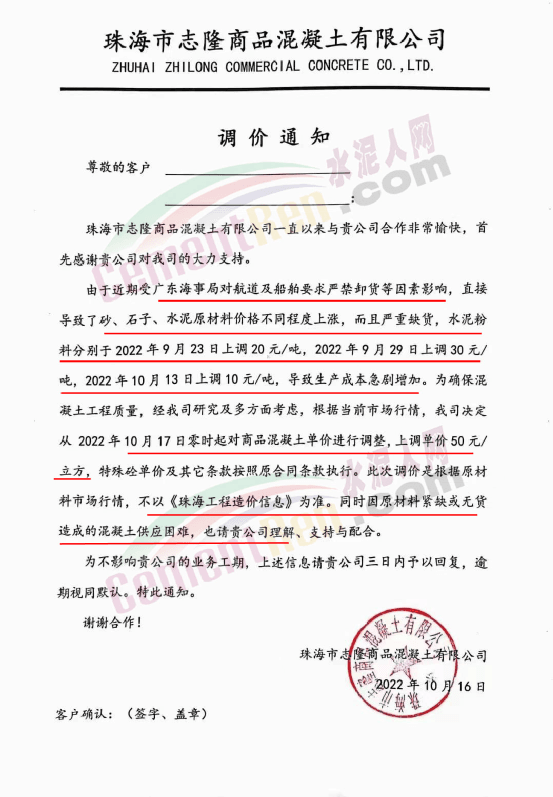 珠海三潤混凝土有限公司、珠海文冠商品混凝土有限公司、珠海市志隆商品混凝土有限公司、珠海市潤濠商品混凝土有限公司、廣東中聯新材料科技有限公司、珠海市錦龍混凝土有限公司、珠海凌宇混凝土有限公司等近十家混凝土企業通知稱,由于廣東海事局對航道及船舶要求嚴禁卸貨等因素影響,直接導致了砂、石子、水泥等原材料價格不同程度上漲。其中水泥分別于2022年9月23日上調20元/噸,9月29日上調30元/噸,10月13日上調10元/噸,累計上調60元/噸,導致了混凝土生產成本急劇增加。為確保建筑工程混凝土質量不受影響,混凝土公司決定各項目各等級混凝土及砂漿價格在原結算單價基礎上上調50元/m³。且強調此次調價是根據原材料市場行情,不以《珠海工程造價信息》為準。同時提到,因原材料緊缺或無貨造成的混凝土供應困難,也請客戶理解、支持與配合。