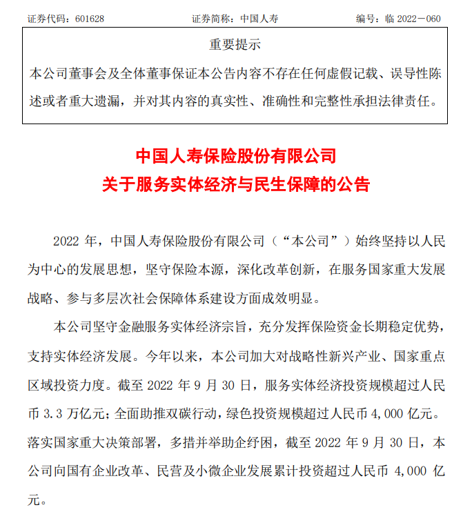 除國有大行外,中國人壽保險16日也發布公告稱,充分發揮保險資金長期穩定優勢,支持實體經濟發展。截至9月末,該公司服務實體經濟投資規模超過人民幣3.3萬億元;在全國承辦200多個大病保險項目,覆蓋近3.5億人。