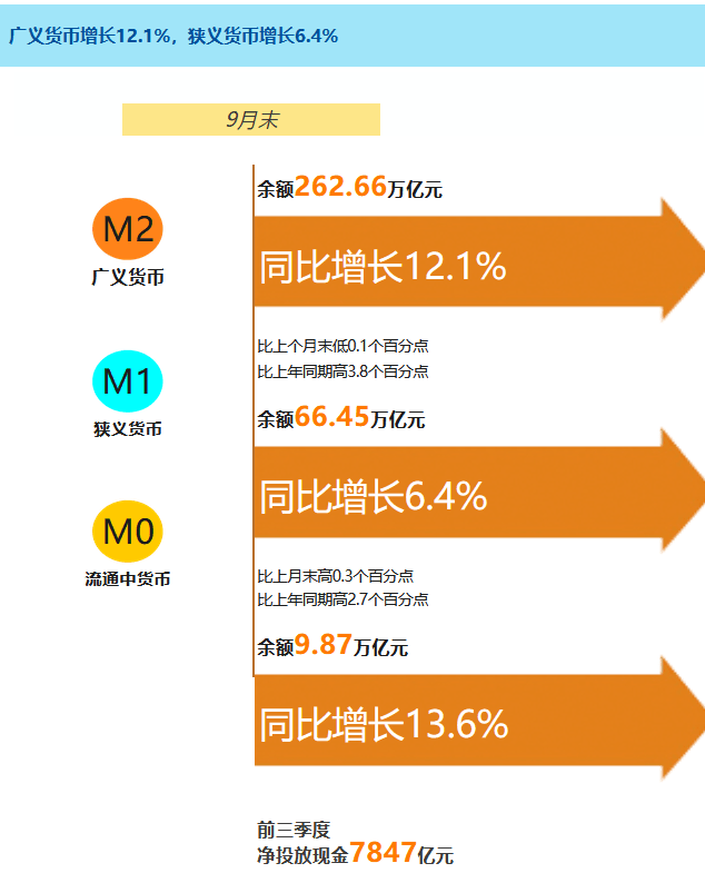 9月末,廣義貨幣(M2)余額262.66萬億元,同比增長12.1%,增速比上月末低0.1個百分點,比上年同期高3.8個百分點;狹義貨幣(M1)余額66.45萬億元,同比增長6.4%,增速分別比上月末和上年同期高0.3個和2.7個百分點;流通中貨幣(M0)余額9.87萬億元,同比增長13.6%。前三季度凈投放現金7847億元。