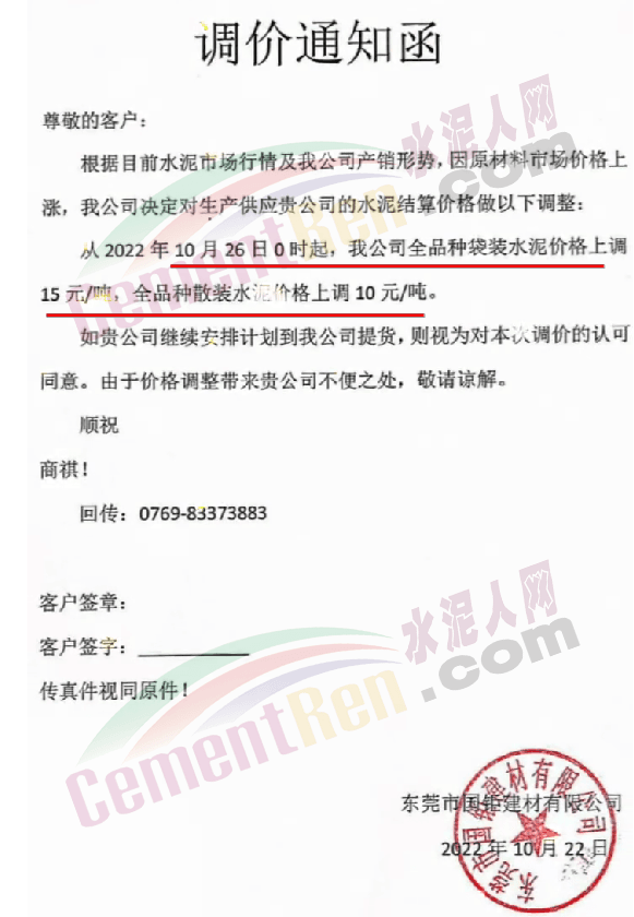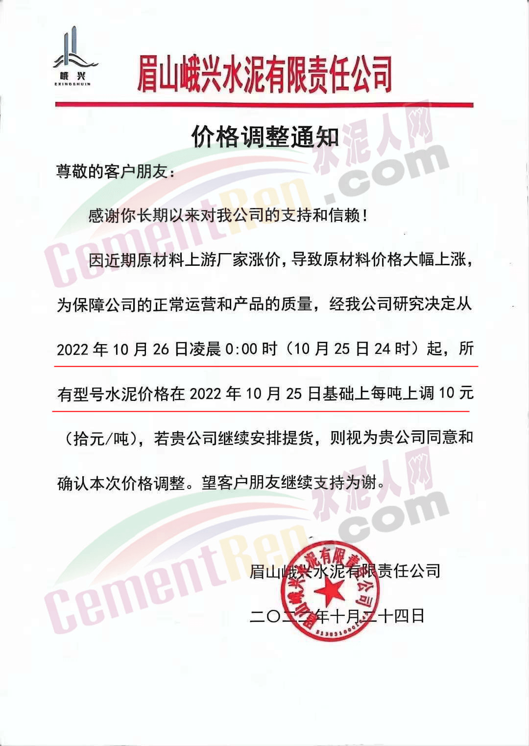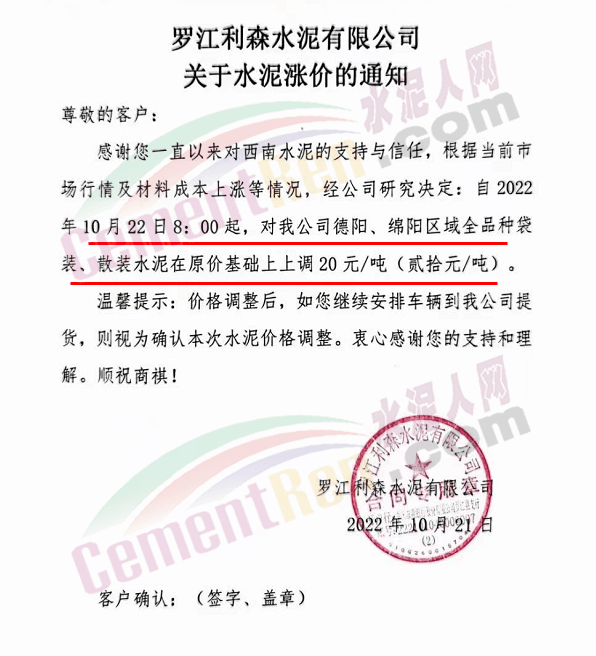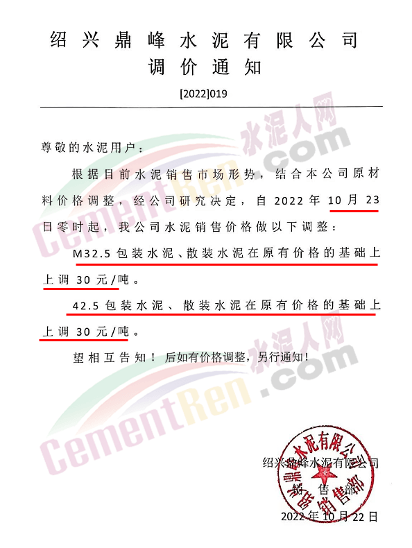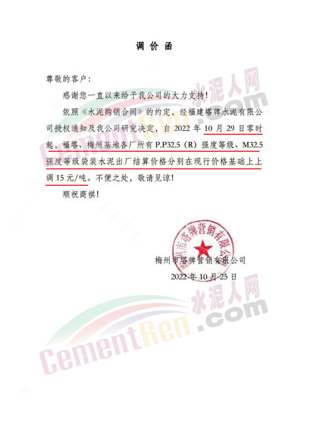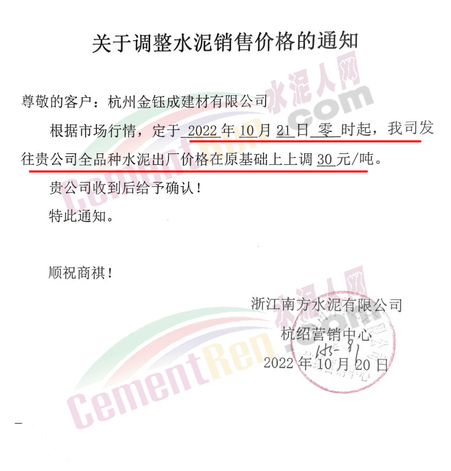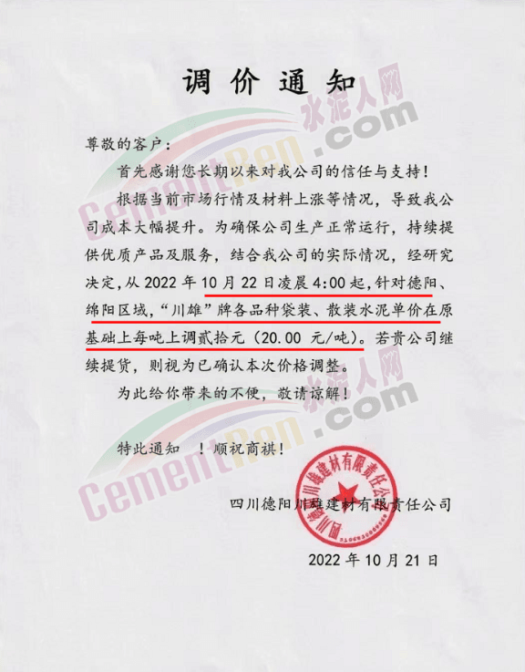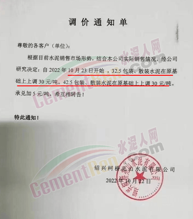 山東蓮山水泥股份有限公司通知,根據市場行情及各種材料和生產成本上漲等情況,經研究決定,從10月24日起對各品種水泥在原基礎上上調15元/噸。