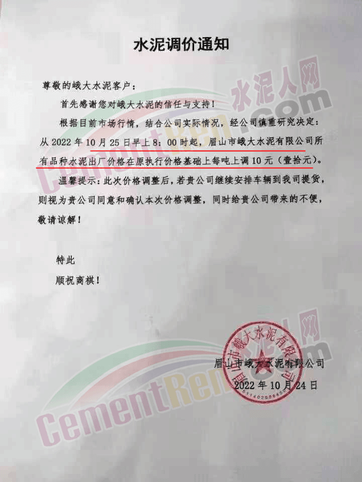 四川眉山多家水泥企業通知上調水泥價格10元/噸,經銷商表示,這是“溫柔一刀”。