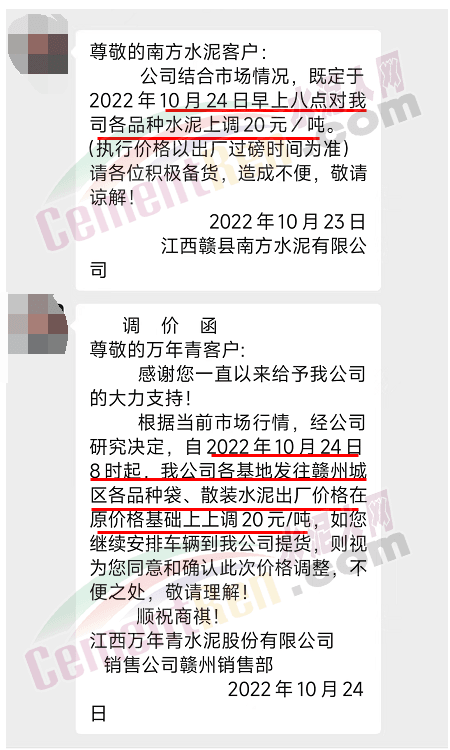 江西贛州區域主要品牌企業萬年青水泥、南方水泥通知24日起上調20元/噸。