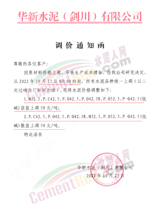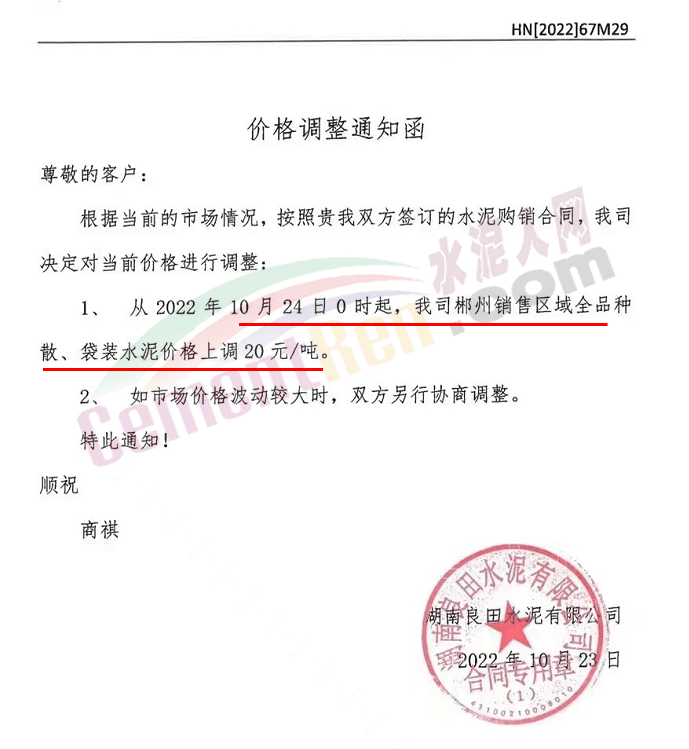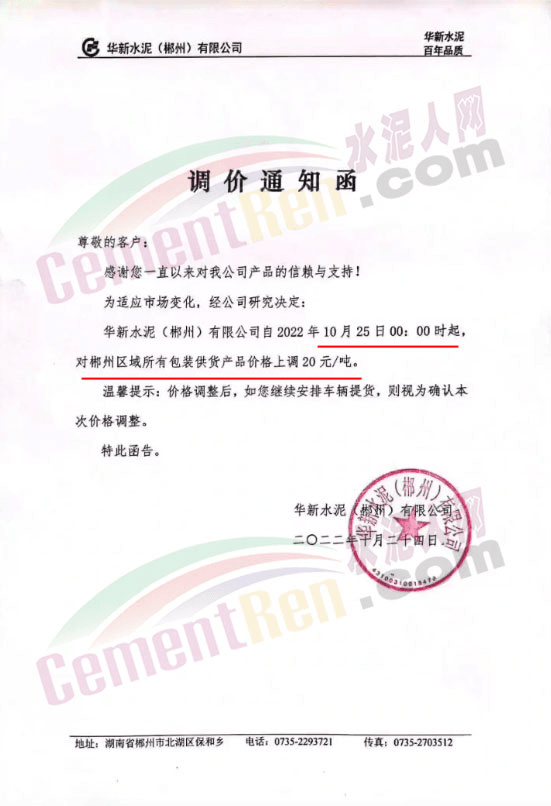 華新水泥(郴州)有限公司通知10月25日起對郴州區域所有包裝供貨價格上調20元/噸。