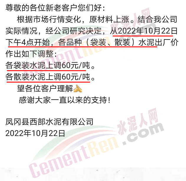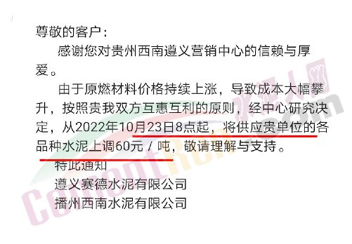 貴州西南遵義營銷中心通知,10月23日起各品種水泥價格上調60元/噸.