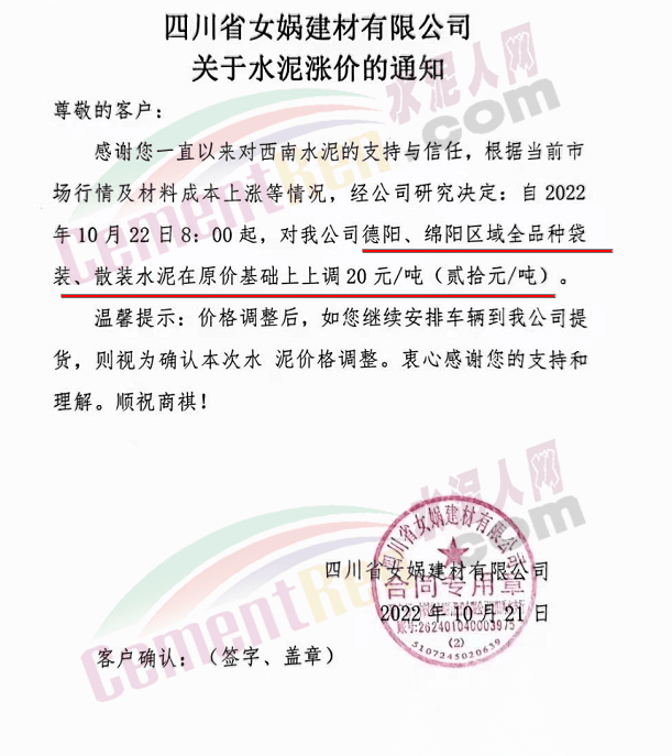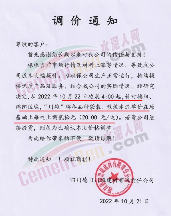 云南省大理白族自治州南澗縣金球建材有限責任公司通知,受原材料價格上漲,電力供應受限,導致公司水泥生產成本上漲。自10月23日0時起上調50元/噸。