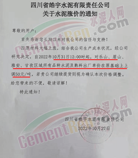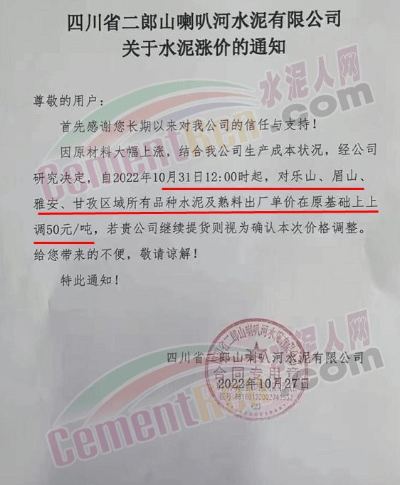 雅安西南、二郎山喇叭河水泥、德勝集團、皓宇水泥通知10月31日12時起,對樂山、眉山、雅安、甘孜區域水泥及熟料價格上調50元/噸。峨眉山西南水泥通知10月31日12時起,成都(含簡陽)區域水泥價格上調50元/噸。