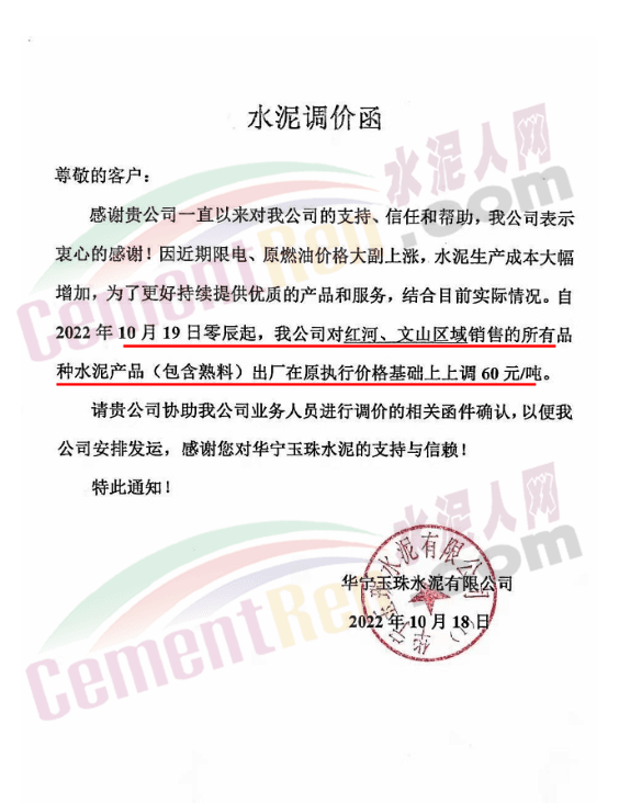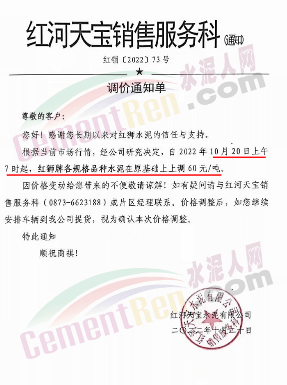江西日江水泥通知,10月28日 零點起宜春、萍鄉、宜豐、萬載區水泥價格上調15元/噸。