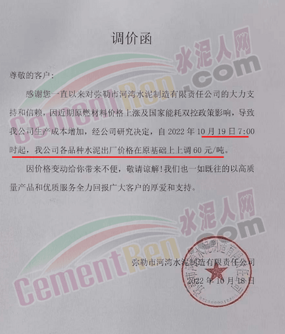 據水泥人網了解,10月下旬以來,云南區域已有多家品牌企業通知上調水泥價格60元/噸。