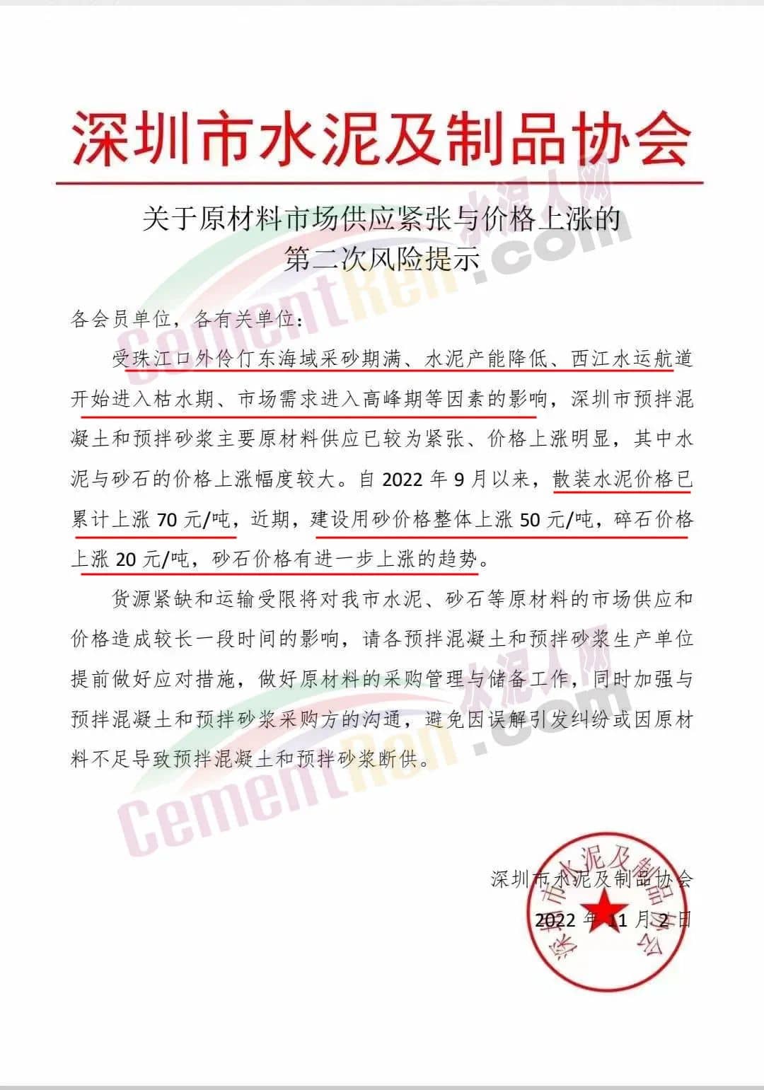 11月2日深圳市水泥及制品協會發布《關于原材料市場供應緊張與價格上漲的第二次風險提示》稱,受采砂期滿、水泥產能降低、西江水運航道開始進入枯水期、市場需求進入高峰期以及水泥、砂石報價上漲等因素的影響,珠三角區域局部市場出現材料供應緊張情況。
