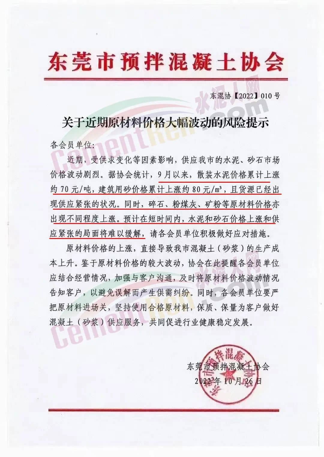 同期,廣東東莞市預拌混凝土協會發布《關于近期原材料價格大幅波動的風險提示》稱近期,受供求變化等因素影響,供應東莞市的水泥、砂石市場價格波動劇烈。