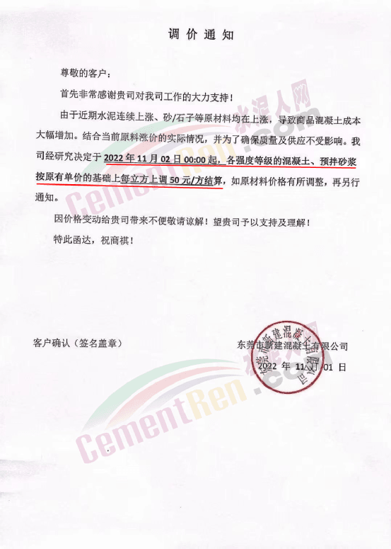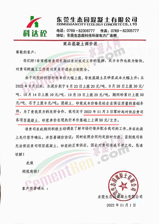 企業調價通知稱,從9月份開始,水泥、砂石等原材料上漲,造成混凝土企業生產成本增加,其中水泥4輪連漲,累計上漲80元/噸,砂上漲40-50元/噸,碎石上漲8-10元/噸。混凝土企業所供各項目的混凝土、砂漿價格跟進上調50元/噸。