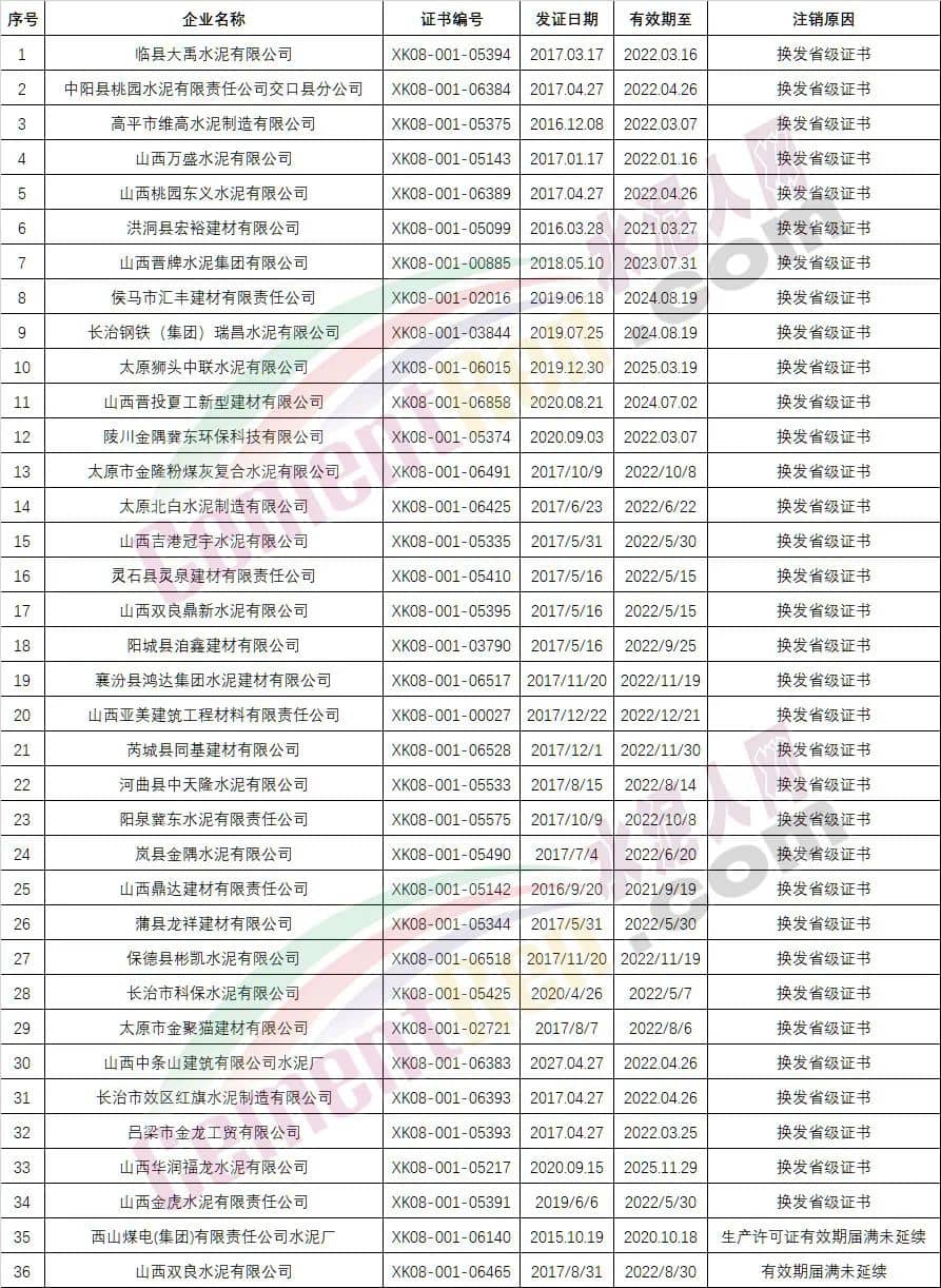 山西省共注銷36家水泥企業生產許可證,其中34家為換發省級下書,一家為有效期屆滿未延續,一家為山西省市場監管局公告注銷;