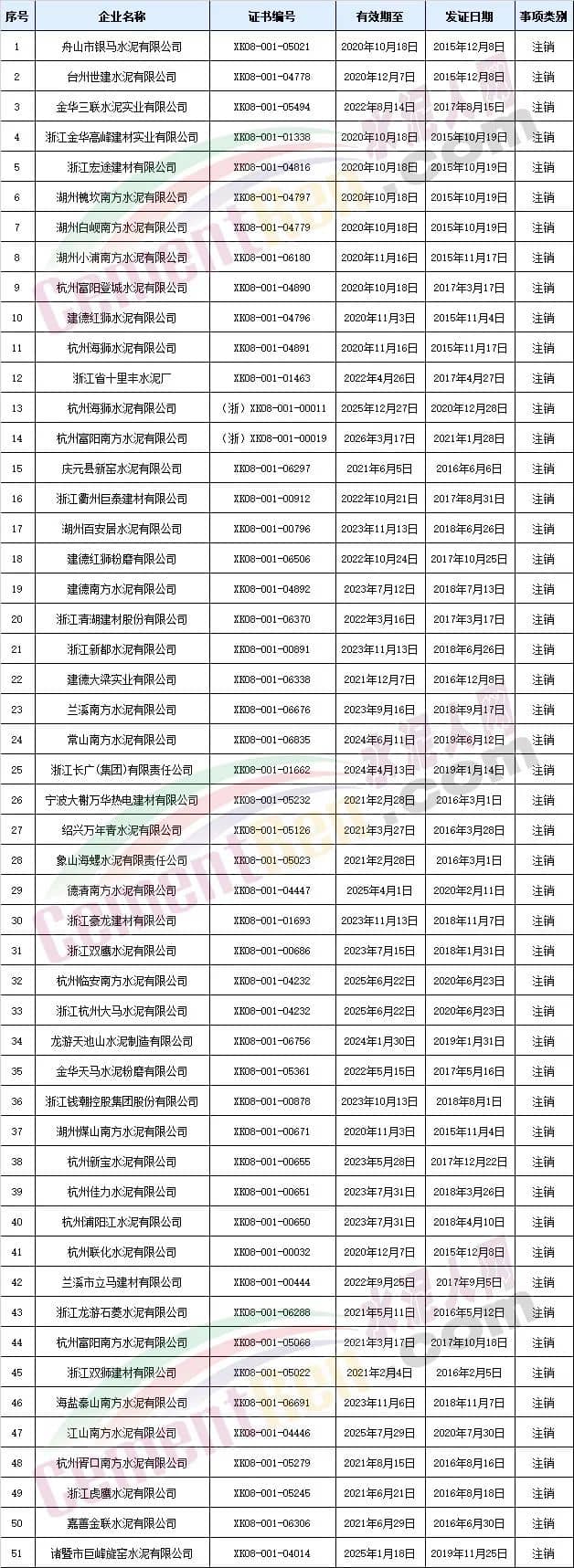 浙江省51個編號水泥生產許可證處于注銷狀態;
