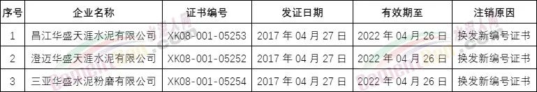 海南省3家水泥企業換發新編號證書,原證書注銷;