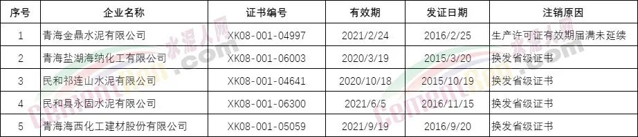 青海省注銷5家水泥企業生產許可證,其中一家許可證有效期屆滿未延續,4家換發省級證書原證書注銷;