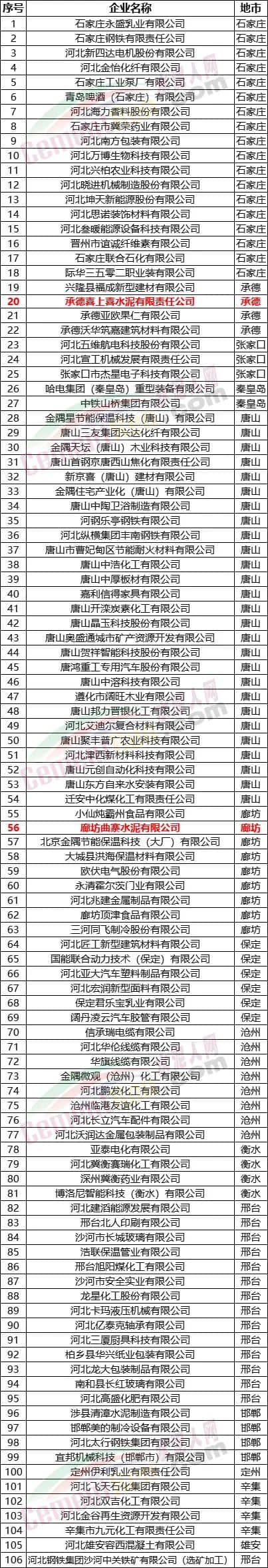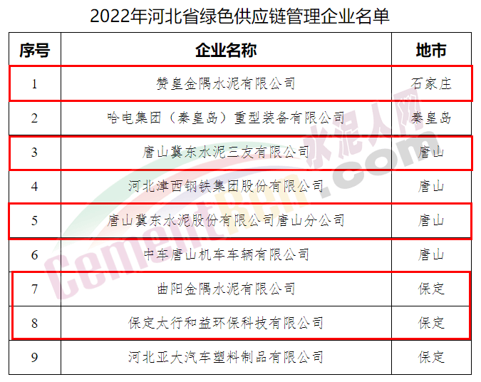 2022年河北省綠色供應鏈管理企業名單中包含贊皇金隅水泥有限公司、唐山冀東水泥三友有限公司、唐山冀東水泥股份有限公司唐山分公司、曲陽金隅水泥有限公司、保定太行和益環保科技有限公司等5家水泥企業。