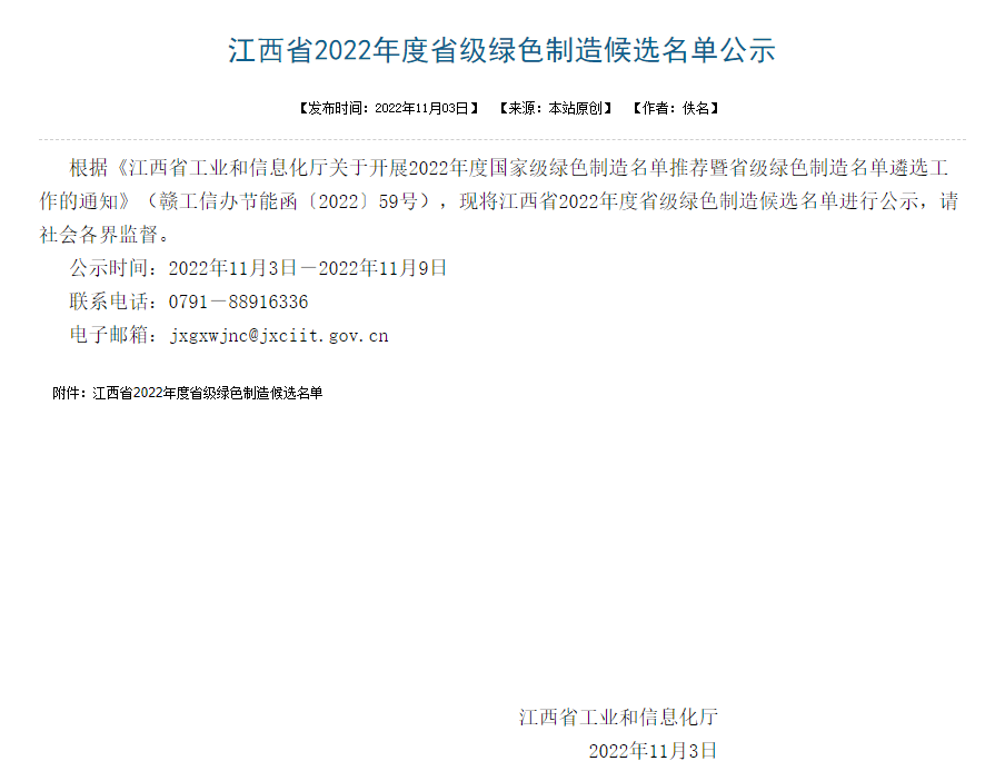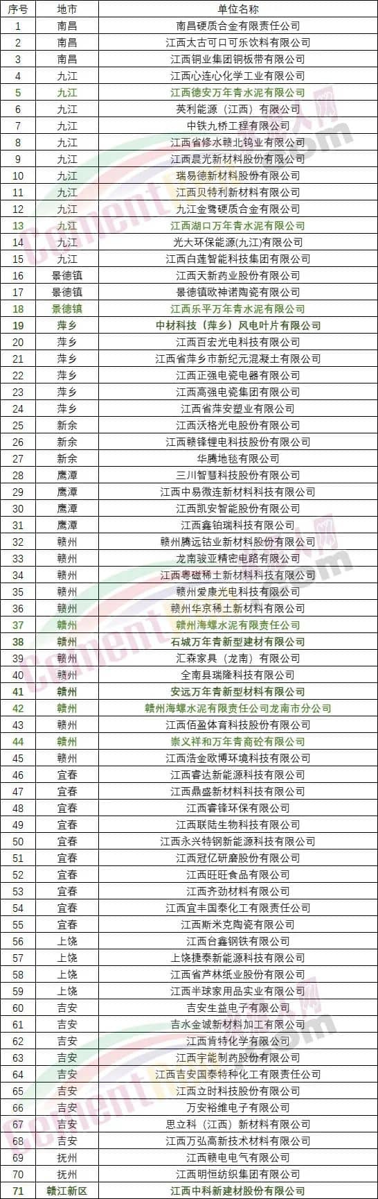 11月3日,江西省工信廳公布《2022年度省級綠色制造候選名單》71家綠色工廠名單中包括江西德安萬年青水泥有限公司、江西湖口萬年青水泥有限公司、江西樂平萬年青水泥有限公司、贛州海螺水泥有限責任公司、贛州海螺水泥有限責任公司龍南市分公司等5家水泥企業。