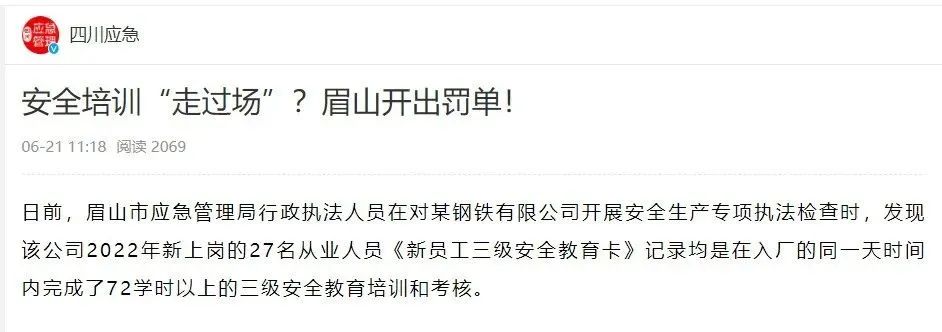 四川眉山市應(yīng)急管理局開展安全生產(chǎn)專項(xiàng)執(zhí)法檢查時,發(fā)現(xiàn)某公司2022年新上崗的27名從業(yè)人員《新員工三級安全教育卡》記錄均是在入廠的同一天時間內(nèi)完成了72學(xué)時以上的三級安全教育培訓(xùn)和考核。