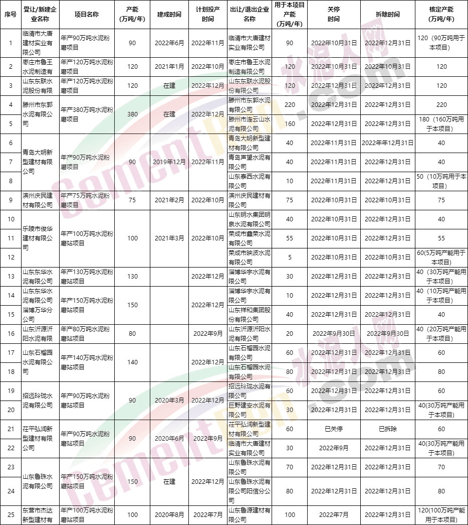 據水泥人網了解,類似的“先上車后補票”式補齊產能,近年來并不少見。而且不僅見于熟料生產線。山東省7月份以來發布的粉磨站補充產能公告包含15個水泥粉磨項目。置換比例均為1:1,核定產能合計1905萬噸/年。退出項目共25個,合計退出1645萬噸/年。