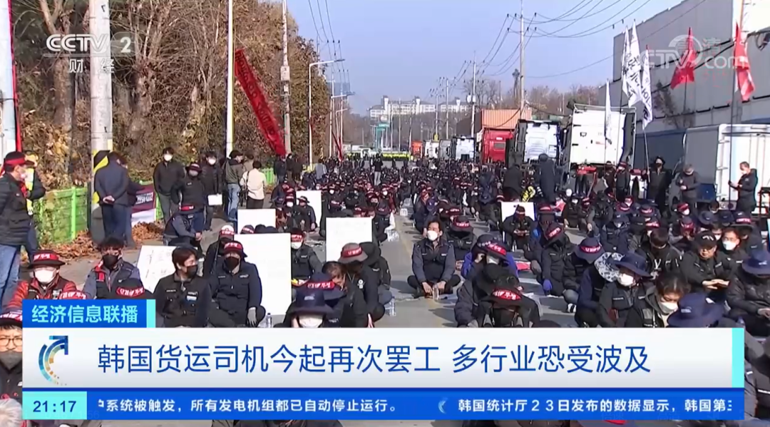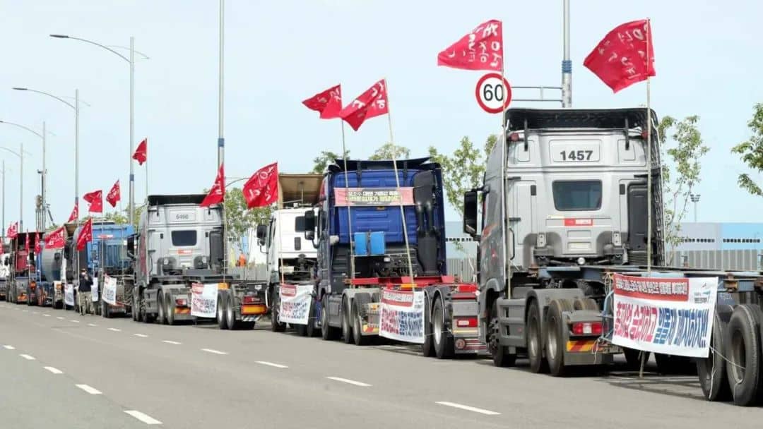 其實,早在11月14日,韓國最大的工會組織之一民主勞動組合總聯(lián)盟旗下貨運卡車工會(Cargo Truckers Solidarity)就宣布,將從11月23日午夜開始發(fā)動無限期罷工,大約2.5萬多名工會成員將通過封鎖鋼鐵、水泥、造船設(shè)備、汽車零部件等主要物流基地以及拒絕貨物運輸?shù)确绞絽⒓恿T工。