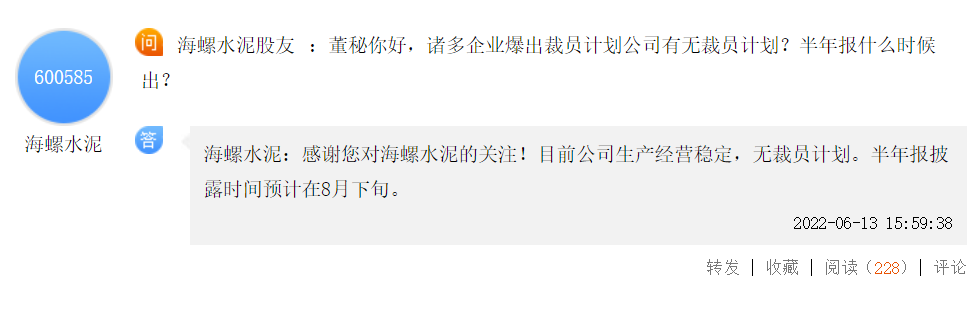 但據(jù)水泥人網(wǎng)了解,近幾個月以來海螺水泥安全獎已減半,且有消息稱虧損企業(yè)年金也將取消。這些“開支”的減少,也等同于少支付了“部分人的薪水”。此前還因云貴區(qū)域錯峰生產(chǎn)強(qiáng)制放假,員工只領(lǐng)不足千元的“低保工資”。