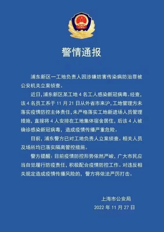 據上海市公安局通報,近日,浦東新區某工地4名工人感染新冠病毒。相關工地負責人因涉嫌妨害傳染病防治罪被公安機關立案偵查。