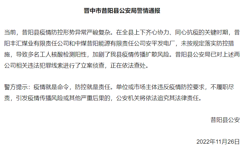 11月26昔陽縣公安局通報,昔陽豐匯煤業有限責任公司和中煤昔陽能源有限責任公司安平發電廠,未按規定落實防控措施,導致多名工人核酸檢測陽性,加劇了當地疫情傳播擴散風險。昔陽縣公安局已對上述兩公司相關違法犯罪線索進行了立案偵查。