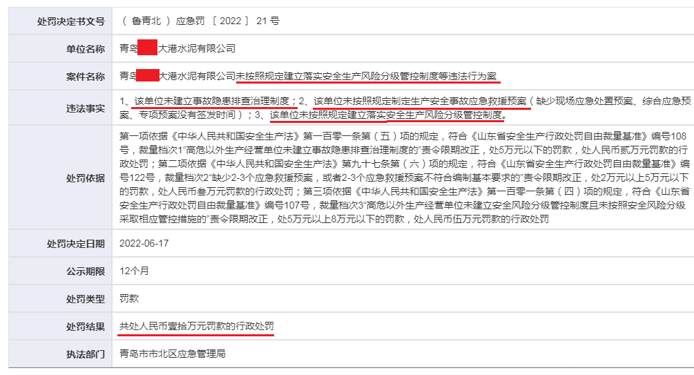 據青島市市北區應急管理局的處罰決斷書,對青島某水泥有限公司未按照規定建立生產風險分級管控制度等行業案作出罰款10萬元的行政處罰。