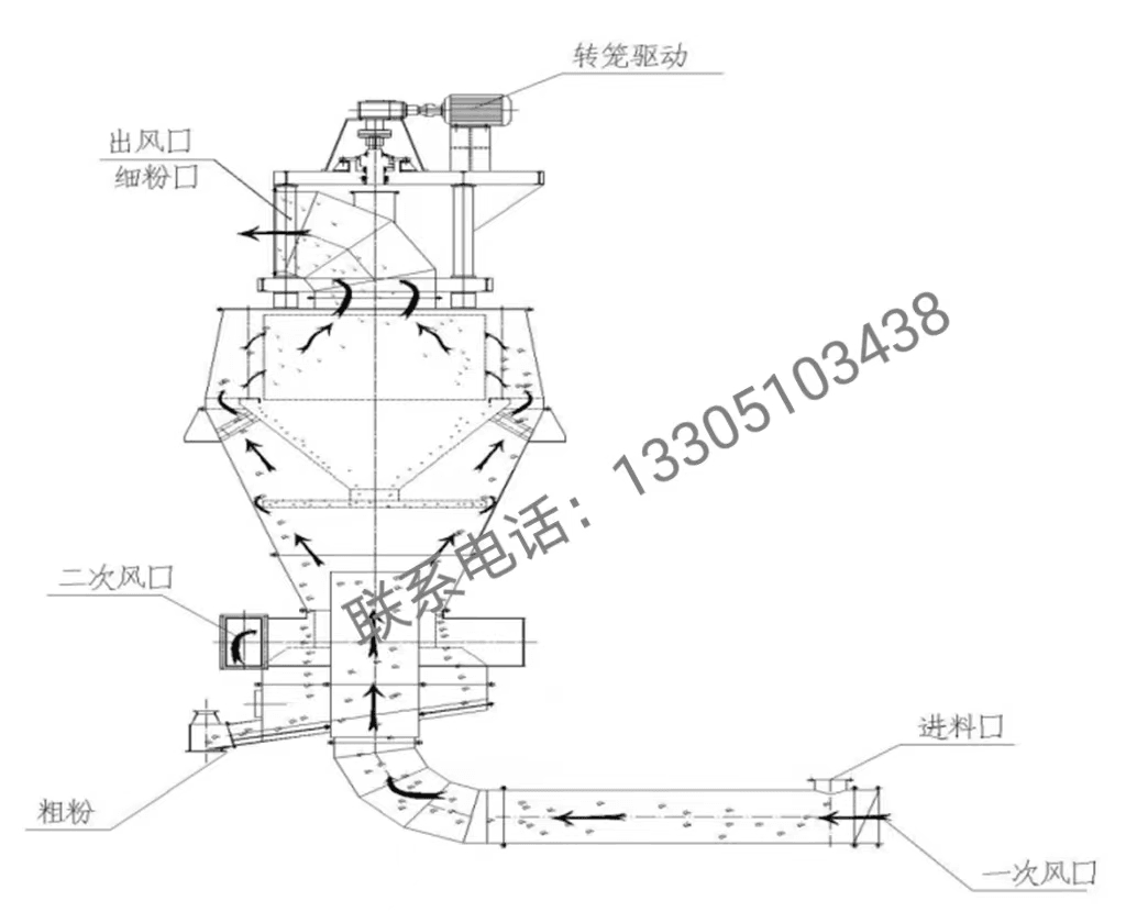 該選粉機突破了原有超細分級機生產能力小、選粉效率低,比表面積難于提高、微細粉宜團聚難于分散等多項技術瓶頸,解決了超細分級設備無法實現大規模分選超細微粉的關鍵技術難題。該選粉機分級精度準,選粉效率高,選粉效率平均值達到80.6%。在高選粉效率的情況下,保證適中的循環負荷(120%),以保證物料在超細球磨機內能夠得到充分的研磨,可根據用戶需要生產比表在700~1000m2/kg的超細微粉。