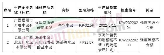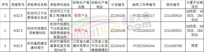 杭州市江干區黃保海五金店和杭州市錢塘區吳彬建材店抽檢到兩批次M32.5水泥為假冒產品,主要不合格項目為3d抗折、3d抗壓、28d抗壓;杭州富陽康亞建材商行M32.5水泥,標稱生產者為江西省九峰建材有限公司主要不合格項目為強度。
