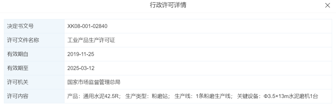 山東江河水泥有限公司生產許可證編號(魯)XK08-001-05307,有效期至2027年1月8日,企業類型為粉磨站;企業擁有1條粉磨生產線;關鍵設備為Φ3.2×13m水泥磨機1臺;企業“恒誠”商標已注冊。