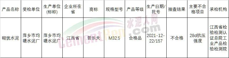 江西省市場監督管理局對全省水泥產品質量進行了監督抽查。經檢驗,不合格產品1批次,涉及的不合格項目為28天抗壓強度。不合格標稱生產單位為萍鄉市均塘水泥廠普樂夫牌M32.5水泥。