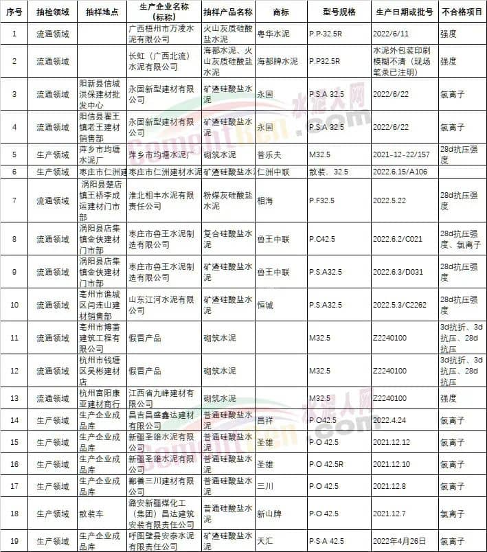 山東省濱州流通領域抽檢同一家企業兩批次水泥氯離子不合格