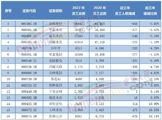 近三年金隅集團、華新水泥、冀東水泥、海螺水泥等10家企業(yè)減員超100人及以上,其中金隅集團減員958人,華新、冀東、海螺減員500人以上。