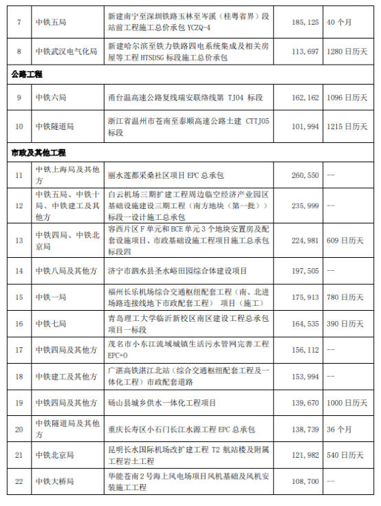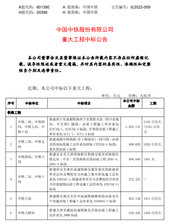 中國中鐵中標價合計約人民幣589億元,約占公司2021年營業(yè)收入的5.51%。