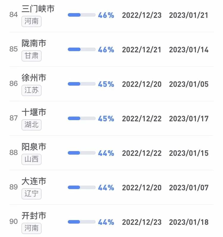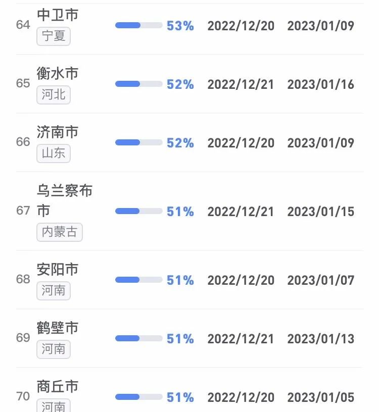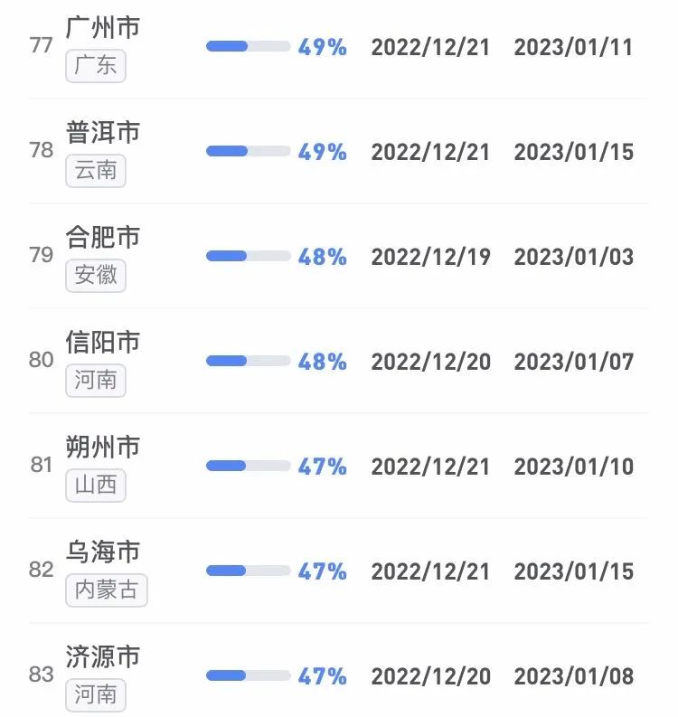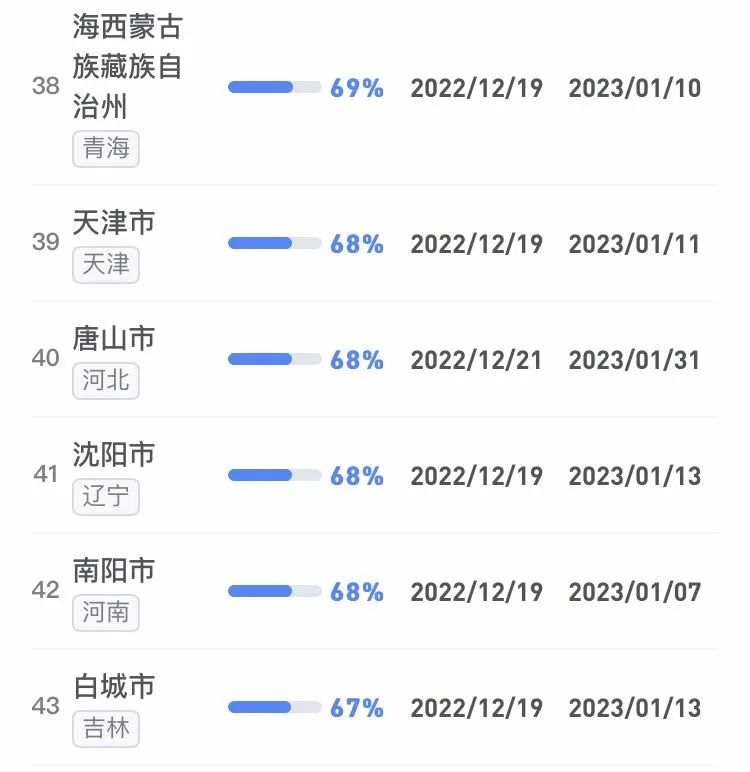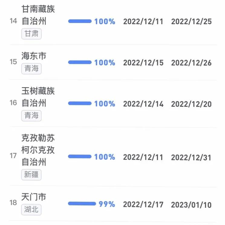 據不完全統計,全國感染進度100%的城市已累計達17個,其中石家莊市、保定市、甘南藏族自治州、克孜勒蘇柯爾克孜自治州均在12日就達到首輪感染峰值。成都市、武漢市等76個市達峰進度已超過50%。