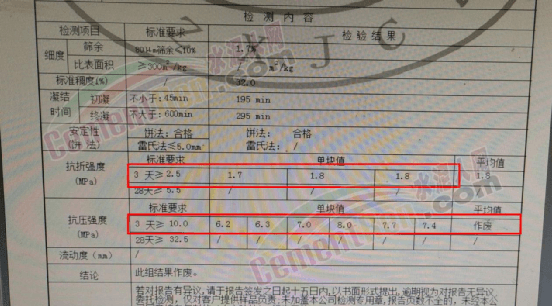 據(jù)了解,王師傅于10月22日和23日兩次從淄博錦川水泥廠共購進(jìn)71噸水泥。發(fā)現(xiàn)水泥不凝固后于10月26日委托山東省建筑工程質(zhì)量檢驗(yàn) 齊河正信建筑質(zhì)量檢測(cè)有限公司檢驗(yàn)。檢驗(yàn)報(bào)告顯示,送樣日期為2022年10月26日,生產(chǎn)廠家為淄博錦川水泥廠,檢驗(yàn)結(jié)果抗壓、抗拆強(qiáng)度均不符合標(biāo)準(zhǔn)要求。
