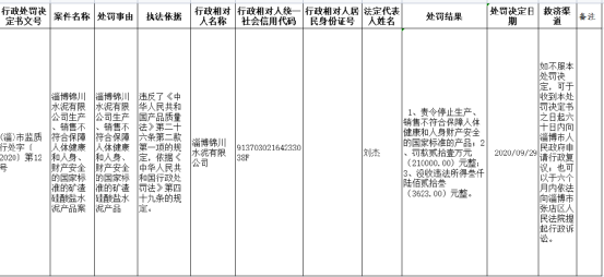 淄博市市場(chǎng)監(jiān)管局信息公布信息顯示,早在2020年淄博錦川水泥有限公司因生產(chǎn)、銷售不符合保障人體健康和人身、財(cái)產(chǎn)安全的國家標(biāo)準(zhǔn)的礦渣硅酸鹽水泥產(chǎn)品被責(zé)令停止生產(chǎn)、銷售不符合保障人體健康和人身財(cái)產(chǎn)安全的國家標(biāo)準(zhǔn)的產(chǎn)品并罰款21萬元,沒收違法所得3623元。