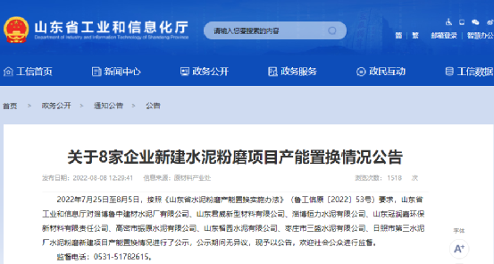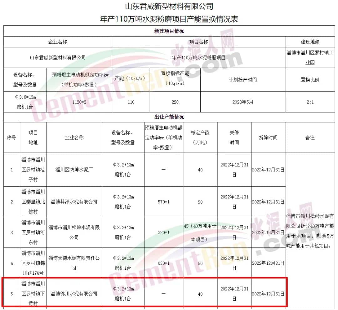 山東省工信廳于2022年8月8日發(fā)布的公告文件中列出的山東君威新型材料有限公司年產(chǎn)110萬噸水泥粉磨項(xiàng)目產(chǎn)能置換情況表顯示,位于淄博市淄川區(qū)羅村鎮(zhèn)下黃村的淄博錦川水泥有限公司一臺(tái)φ3.2*13m磨機(jī)將于2022年12月31日前關(guān)停并拆除。
