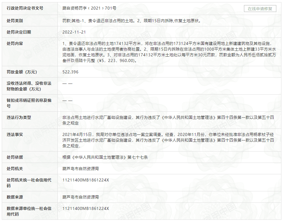 冀東水泥葫蘆島有限責(zé)任公司因未經(jīng)批準(zhǔn)非法占用楊家杖子經(jīng)濟(jì)開(kāi)發(fā)區(qū)土地進(jìn)行水泥廠基礎(chǔ)設(shè)施建設(shè),違反了《土地管理法》。11月21日被葫蘆島市自然資源局一次性罰款522.396萬(wàn)元。并要求其退還土地,拆除已建地面,恢復(fù)土地原狀。