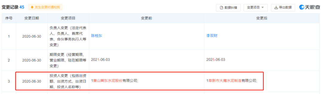早在2020年6月30日企業(yè)投資人由唐山冀東水泥股份有限公司變更為阜新市大鷹水泥制造有限公司。企業(yè)法人也由陳桂東變更為李雙財(cái)。
